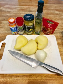 Potato bake ingredients: 2 whole sweet peppers, half a medium yellow onion, 3 large baking potatoes, 3-4 tablespoons of olive oil, 1 tablespoon of Aji (chili pepper), salt and pepper to taste.
