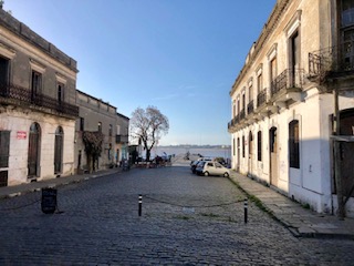 We arrived at the ferry station about an hour later. We sailed through customs, collected our luggage and hailed a cab. Our driver was a jovial fellow, who wore a beret and played festive music. We managed to speak a little Spanglish between us and learned a few townie tidbits during the ten minute drive. Meanwhile, Iโm peering out of the window growing more amazed by the second at how inviting and quaint this little city is. I ask my husband โwhere are we again?โ He patiently informed me that we are in Colonia (what the locals call it). Our accommodations were located right on the enchanting Rio de la Plata which shimmered in the afternoon sun. As soon as we set foot on the ground, I had the feeling that I never wanted to leave.ย ๐ โต๏ธโ๏ธ