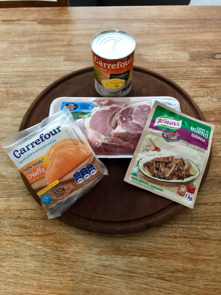 To prepare: Marinate a small pack of pork chops with barbecoa seasoning packet, 1/4 cup water and 1/4 cup of oil for a minimum of 5 hours. Bake pork chops at 200 degrees Celsius (400 Fahrenheit) for 25 minutes. You can do this the day before and repurpose the leftovers. Once cool, cut the chop into small cubes. Place empanada wrapper on baking sheet and brush egg wash on one end. Place chop and pineapple pieces in the middle, fold over and seal with a fork. Repeat with remaining ingredients. Bake at 200 degrees Celsius for about 10 minutes or until just brown on the top.