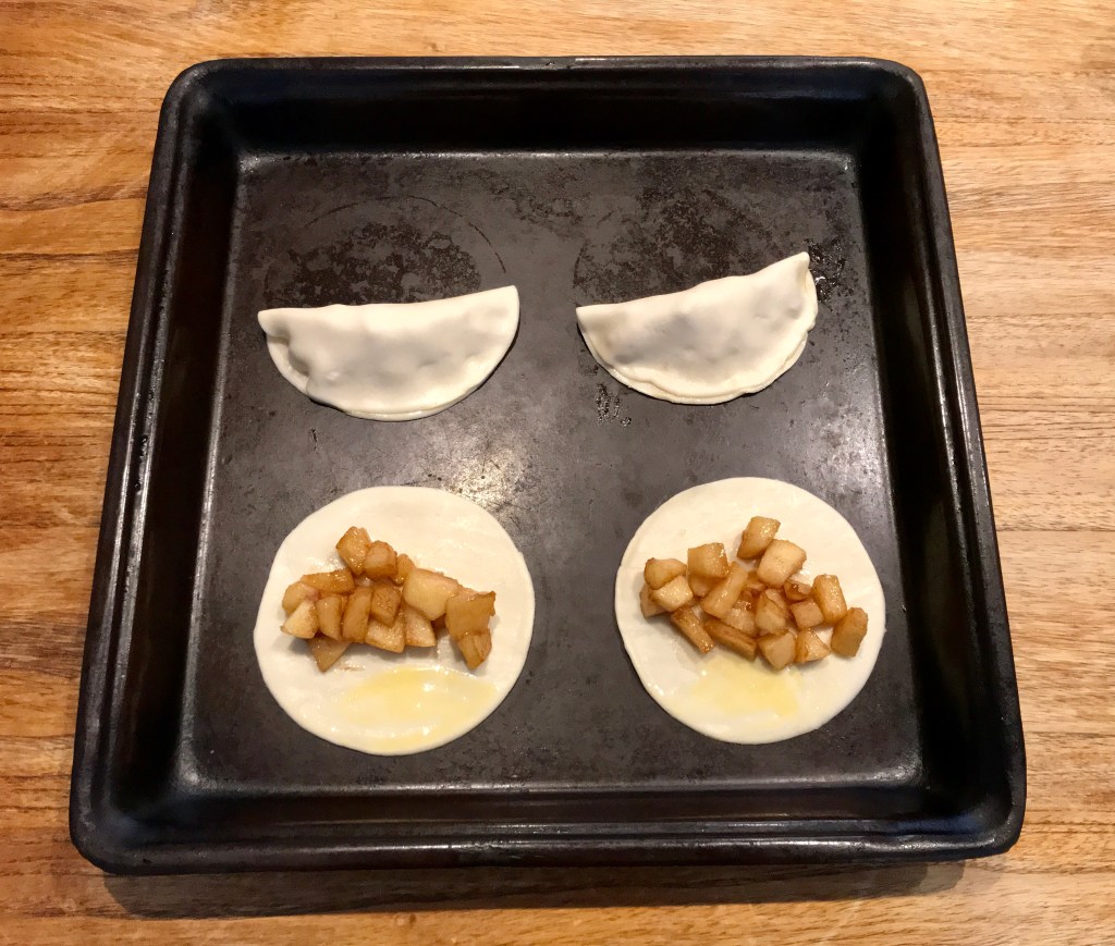 To prepare: Peel, core and chop apple into bite sized pieces. Melt butter in pan and add apple, sugar, cinnamon and salt. Let mixture cook down for approximately ten minutes, stirring periodically. Set aside to cool, lay empanada wrappers on baking sheet and brush the bottom edge of one side with egg wash. Spoon apple filling in the middle, fold over and seal with a fork. Repeat with remaining ingredients. Place in freezer for about half an hour until firm. Remove, brush tops with egg wash and then dust with cinnamon sugar. Bake at 200 degrees Celsius for about 10 minutes or until reaching a golden hue.