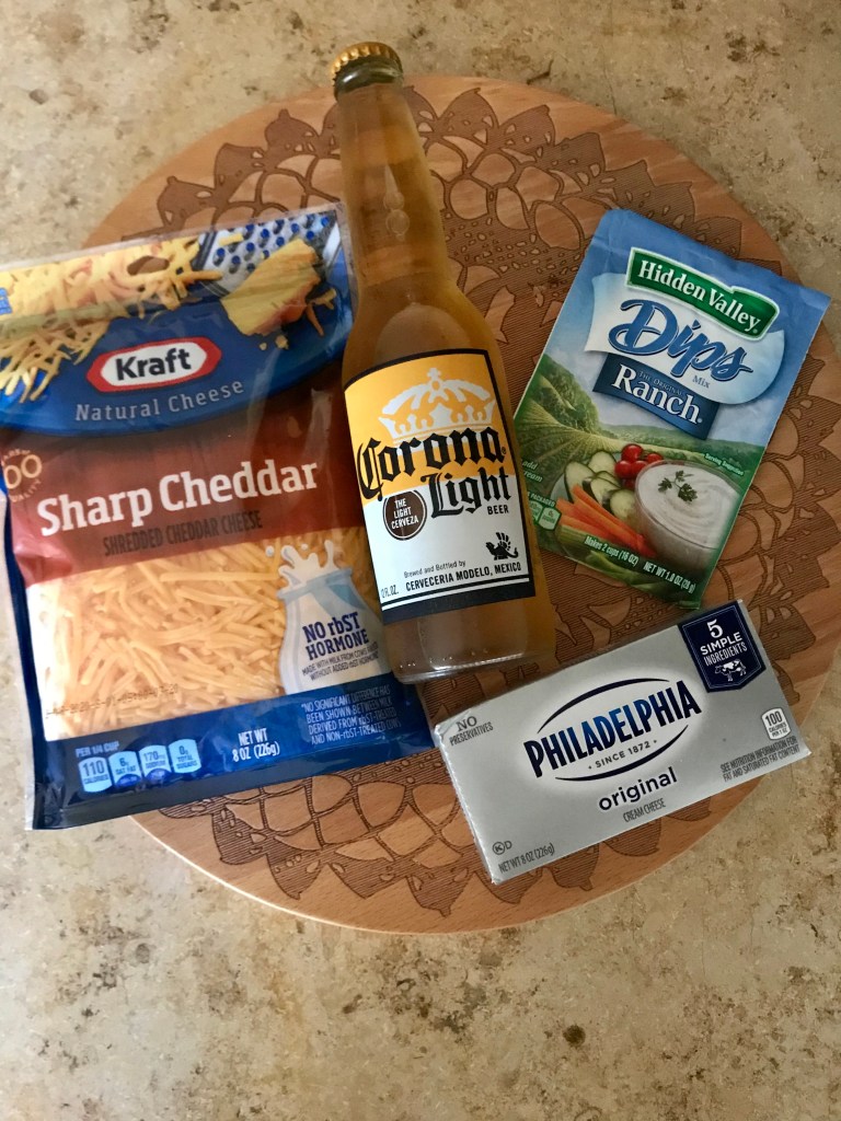 Ingredients: 3/4 packet of Hidden Valley Ranch seasoning, 8 oz pack of cream cheese, 2 cups of shredded cheddar cheese, 1/4 cup of beer