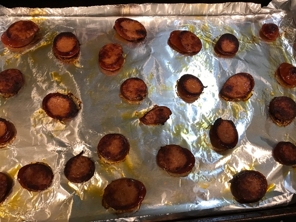 To prepare: Boil pasta until al dente, drain. Combine crushed tomatoes and tomato paste in a sauce pan, season to taste and simmer down for at least 15 minutes. Slice one link of andouille sausage into coins, place on foil lined sheet pan and bake on 400 for about 15 minutes or so, turning over once. When done, take out and drain on paper towels. Turn oven temperature down to 350 degrees. Heat olive oil in frying pan. Add half bag of baby spinach, salt, pepper and sauté until wilted. Repeat process with remainder of the bag then set aside. Spoon a few tablespoons of sauce on the bottom of a baking dish. Add half the cooked pasta shells, spinach, sausage, another layer of sauce and cheese. Repeat with remaining ingredients. Bake covered for 20 minutes, then uncovered for an additional 10-15 minutes until the cheese on top has sufficiently melted. Allow at least 10 minutes to firm and do its thang!😉😋🥳