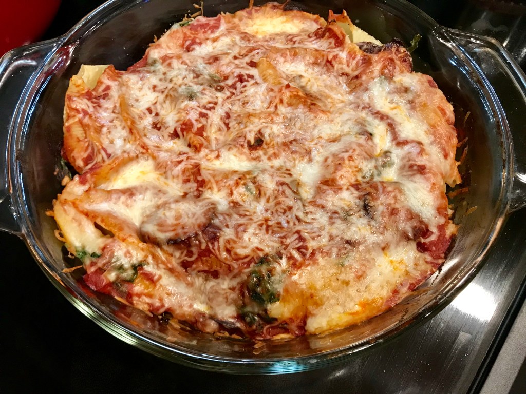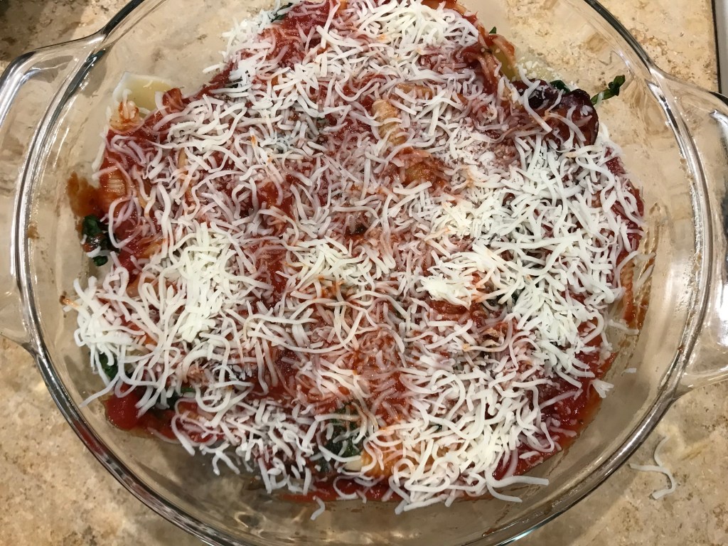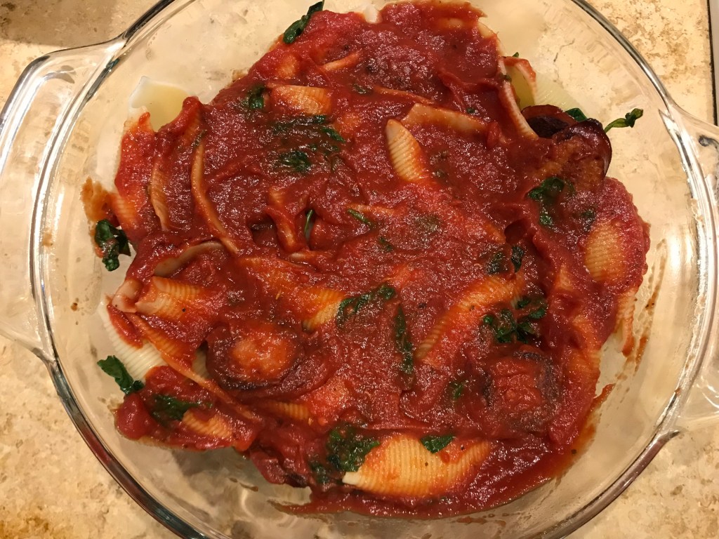 I selected a deep glass baking dish and spooned a little sauce on the bottom. I place half of the shells on top and proceeded to tuck some spinach over In each one. I layered half the sausage over this, spooned over more sauce and sprinkled half the mozzarella. I repeated the layers once, covered with foil and then baked on 350 for 20 minutes. I uncovered the dish and baked for an additional 13 minutes until the top layer of cheese melted. I allowed it to rest for 15 minutes before diving in.