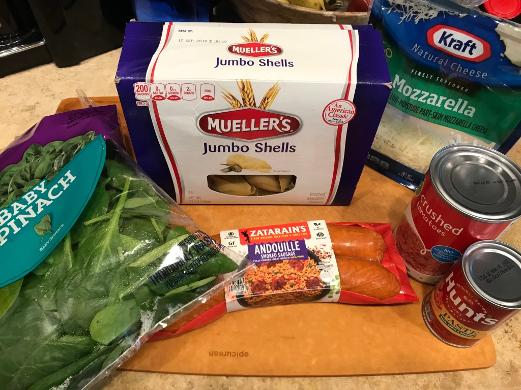 You will need: 1/2 box of jumbo shell pasta, 1 bag of baby spinach, 1.5 cups shredded mozzarella, 1/2 pack of andouille sausage, 1 can crushed tomatoes, 1 can herbed tomato paste