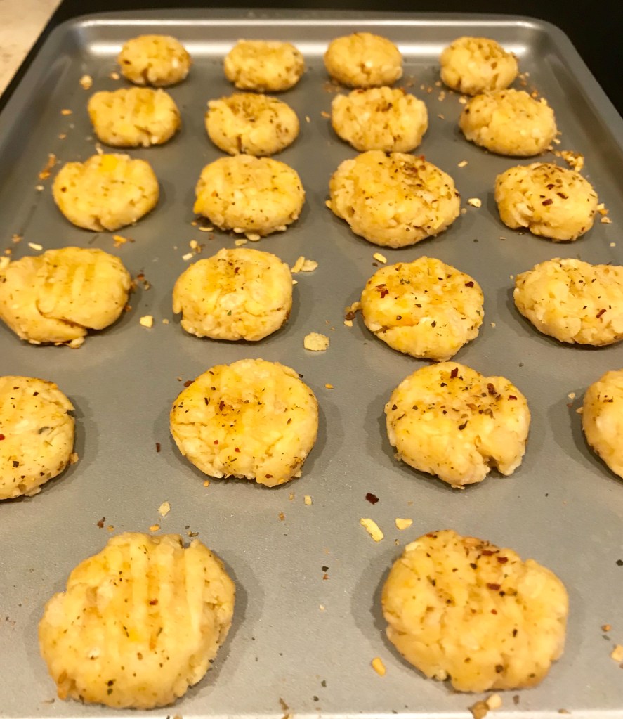 Outcome📝: Meh. They were a little bland and soft. They didn’t crisp up and had the texture of a cookie vs. a crispy. I added more seasoning to the second batch but still just eh….We will eat them mind you but these will need some more tinkering for sure!