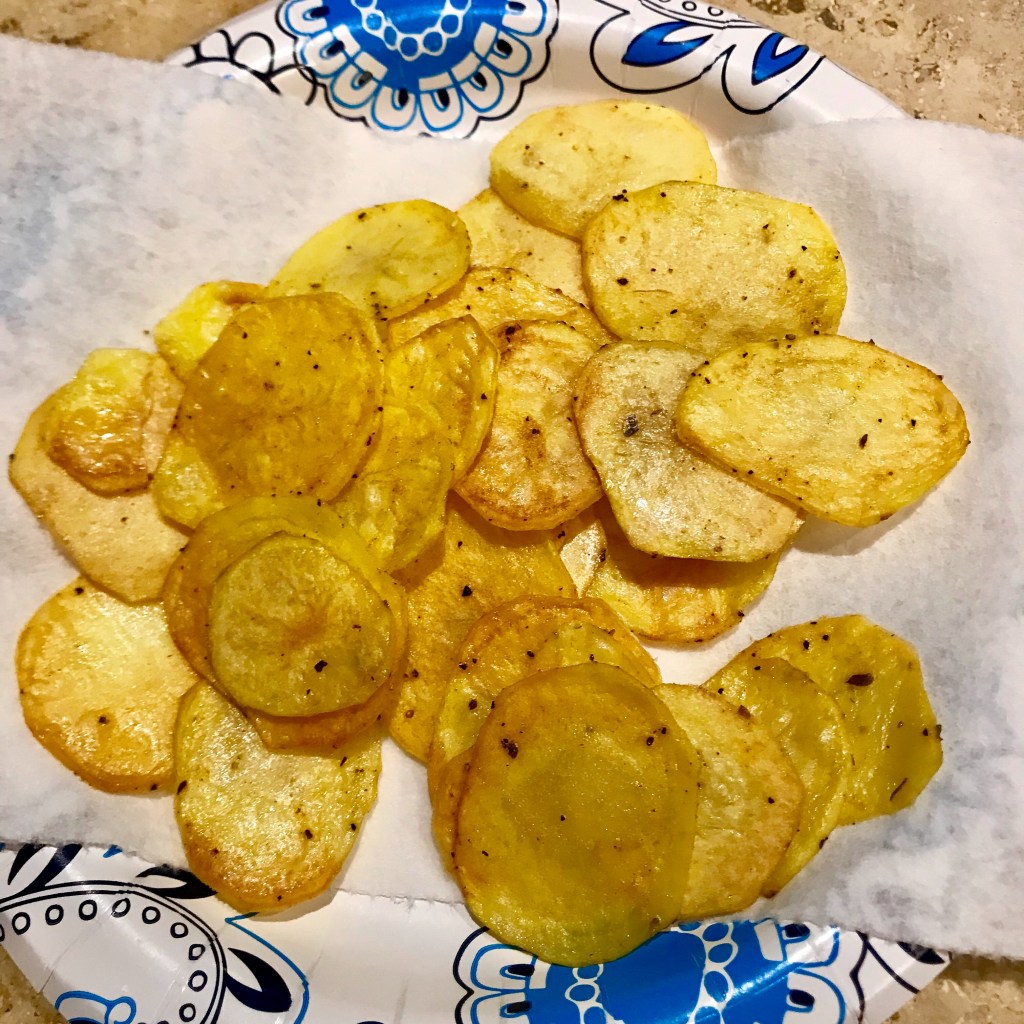 I’m a huge fan of potato chips. I know they’re just empty calories but they’re so darn delicious! They may not truly satisfy your appetite but they sure do wonders for your taste buds.😋 I had a few small potatoes that I needed to use up and thought, why not? I’ve made oven baked sweet potato chips before but have struggled a bit with consistency, even after using a mandolin. For instance, the thinner ones tend to burn easily while the thicker ones don’t want to crisp up.
