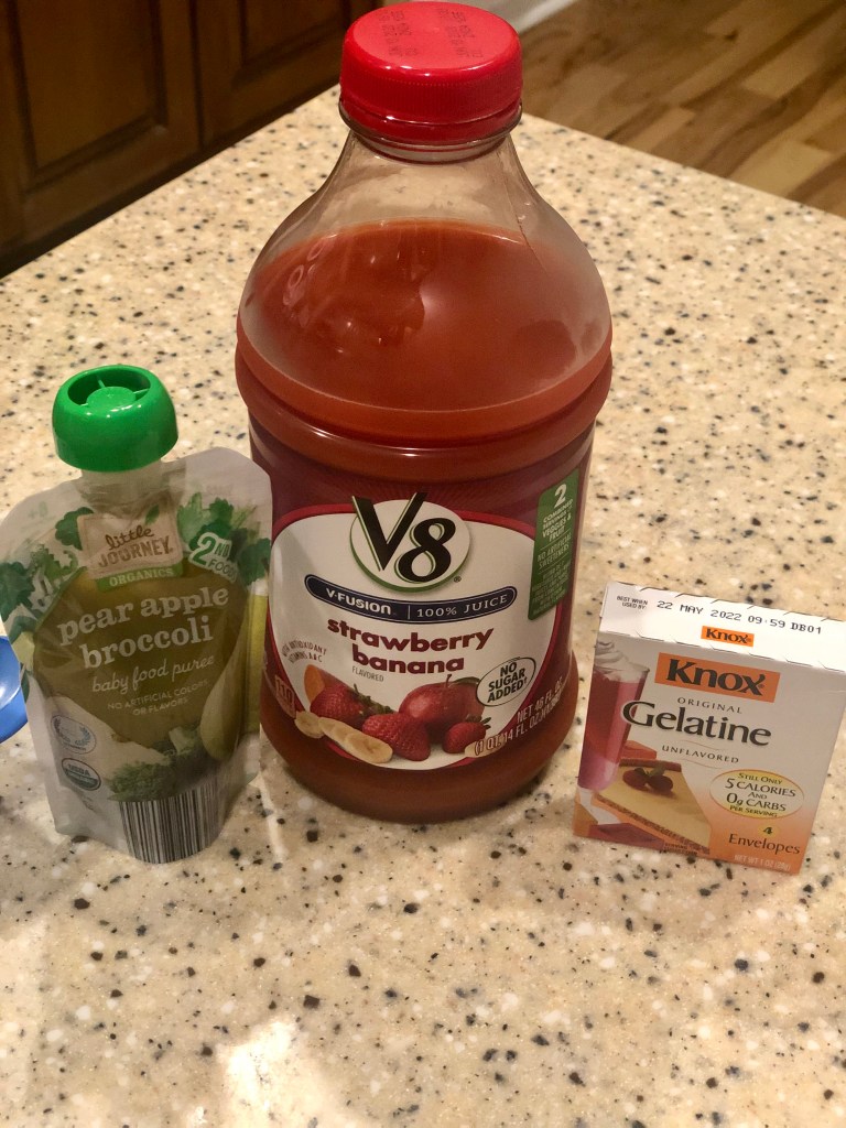 You will need: 3/4 cup of juice (any will work but I picked V8 Fusion because it has veggies too)