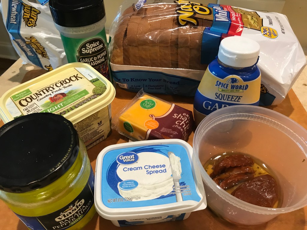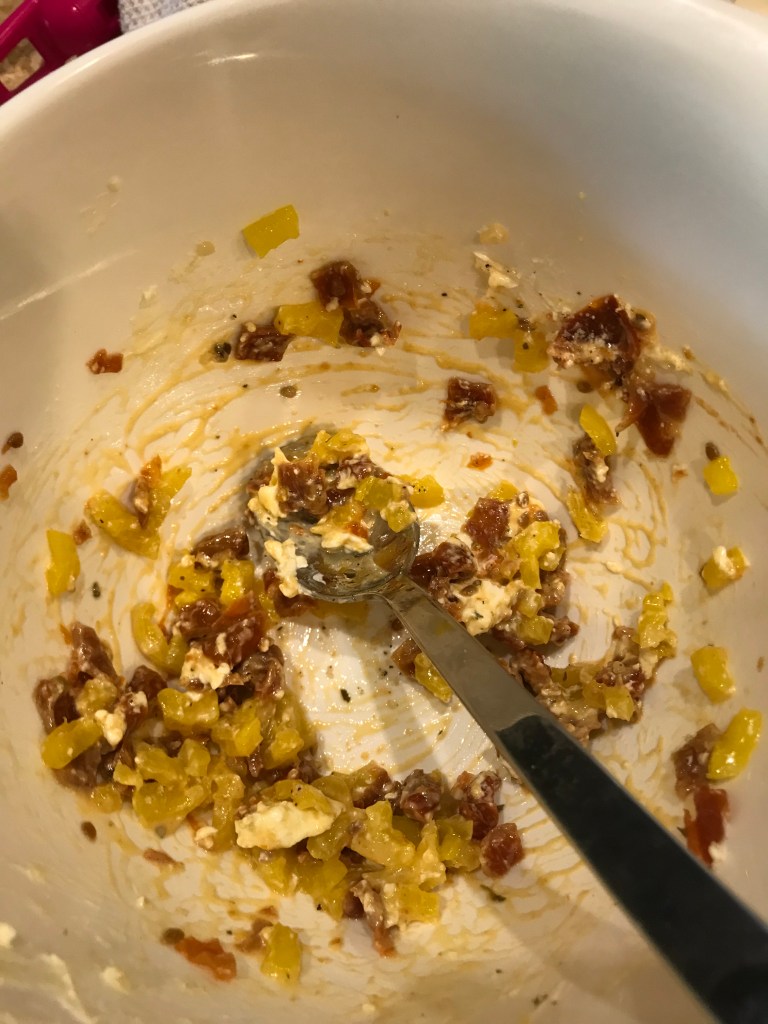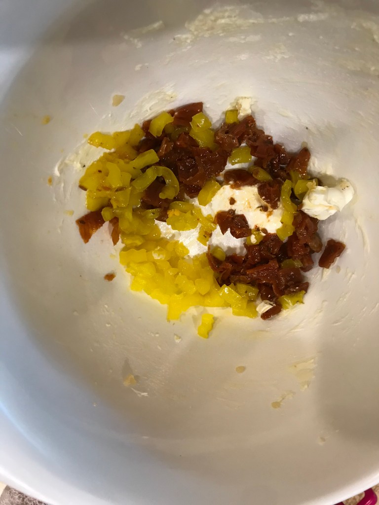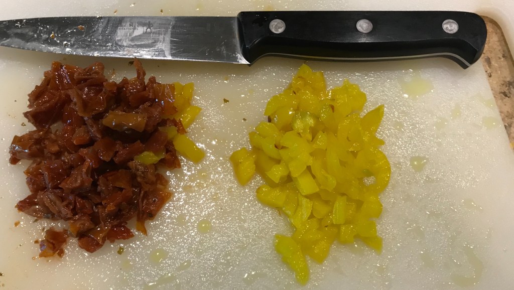 Dice up a few sun-dried tomatoes and 10 or so banana pepper rings.