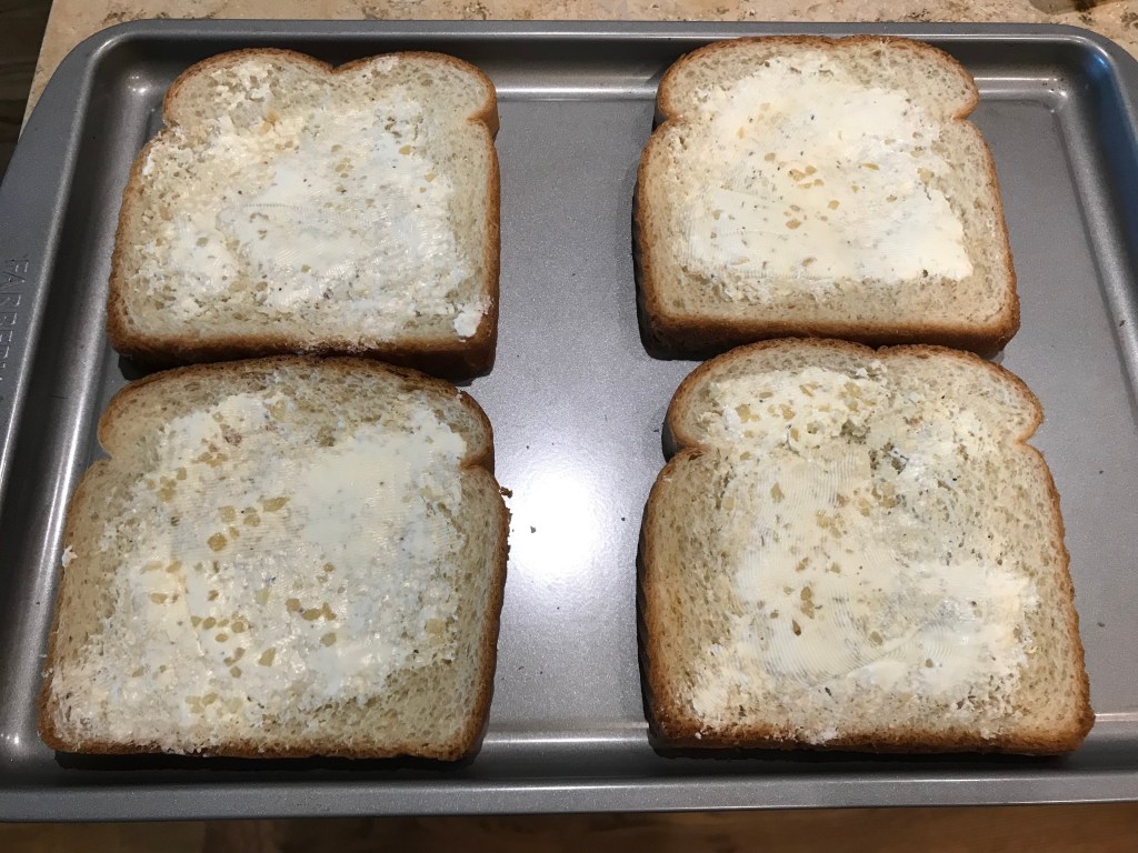 Scoop out a few spoonfuls of butter and a couple dots of minced garlic. Add a few shakes of garlic pepper and stir well. Spread mixture onto four pieces of bread. Add a little more butter around the edges if needed.