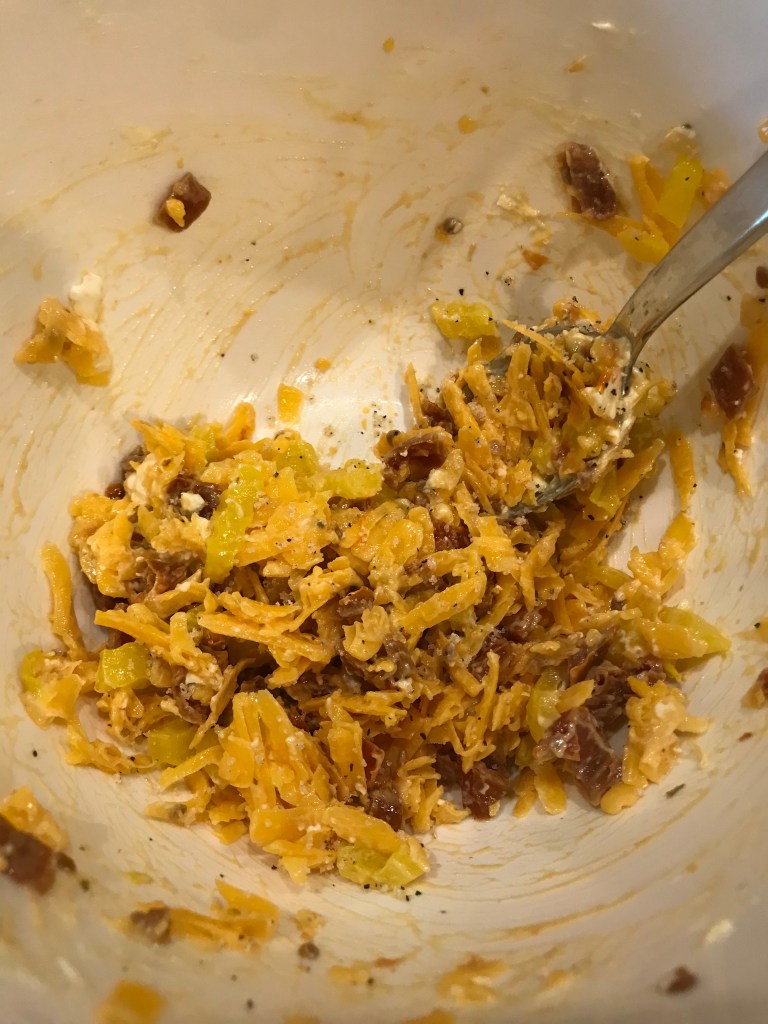 Scoop out a few spoonfuls of cream cheese. Add diced veggies and stir. Add shredded cheese. Season with more garlic pepper and stir well.