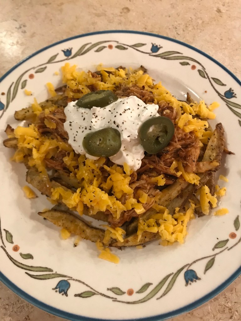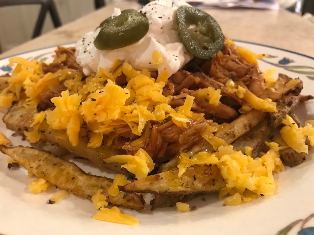 Step 3: I served my “fries” with leftover bbq chicken, shredded cheddar, sour cream and a few jalapeños. ‘Twas very gooood! In fact, I may never buy frozen French fries again!