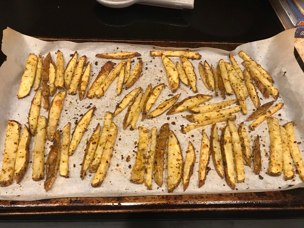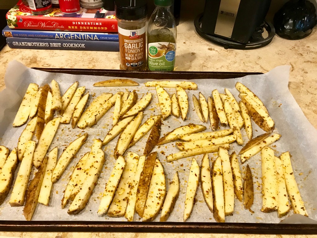 Step 2: I hand cut a few russet potatoes, tossed with olive oil and McCormick all purpose seasoning, and double baked in the oven until crispy.