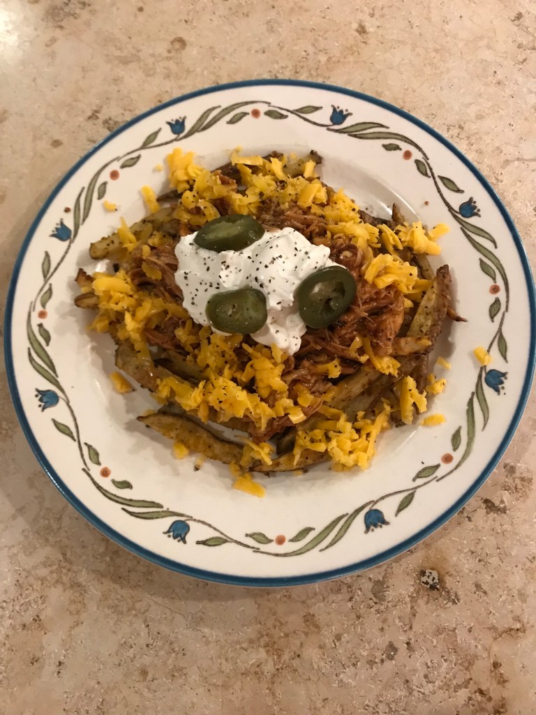 My cornerstones of quarantine have been potatoes, cheese, frozen chicken breasts and a little ingenuity. This dish embodies all of my newfound culinary principles. I’m choosing to embrace limitations as a challenge instead of a handicap. For example, if you’re craving nachos but don’t have any chips make frychos!😉