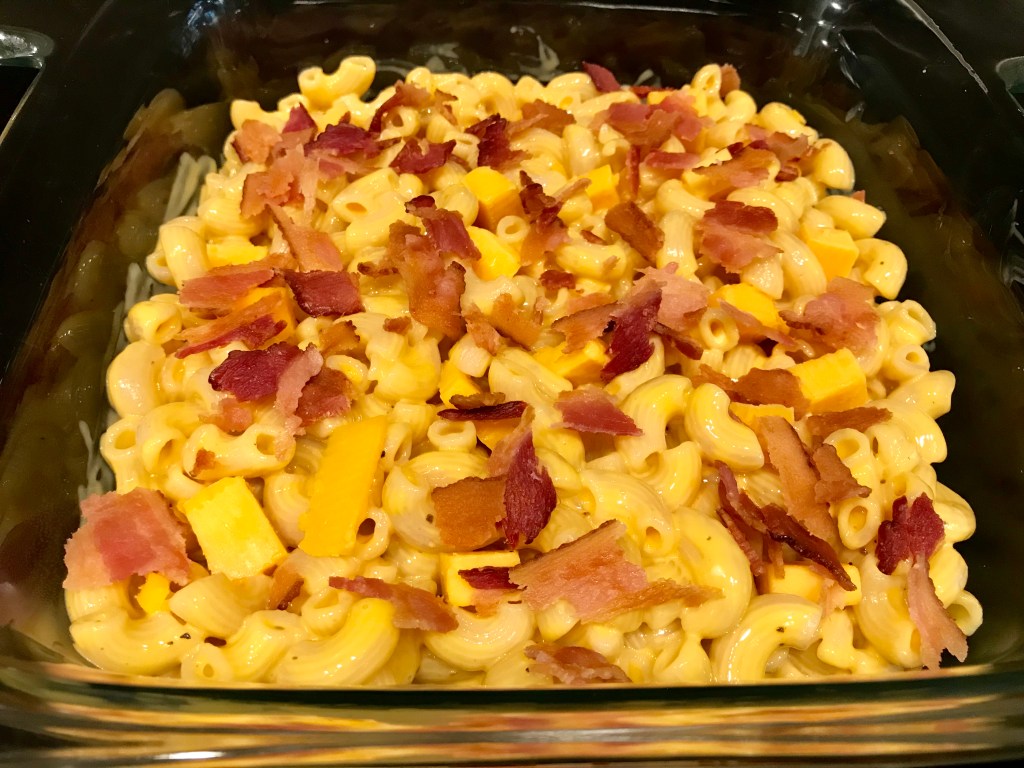 Right now, like a lot of people, I don’t have many opportunities to get to a proper grocery store. Sometimes Dollar General will just have to do. On the bright side, they have bacon and macaroni and cheese! All of a sudden, I found myself in the mood for baked macaroni and cheese. I have attempted this many times before from scratch with varying degrees of success. I’ve tried béchamel and toasted breadcrumbs. I’ve experimented with different types of noodles and cheese. But they’ve all turned out kind of bland…