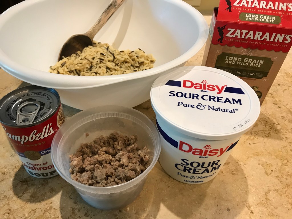 You will need: 1 package of long grain wild rice, 1 can cream of mushroom, 1/3 cup of sour cream, 1/2 tube of mild country sausage (about 8 oz)