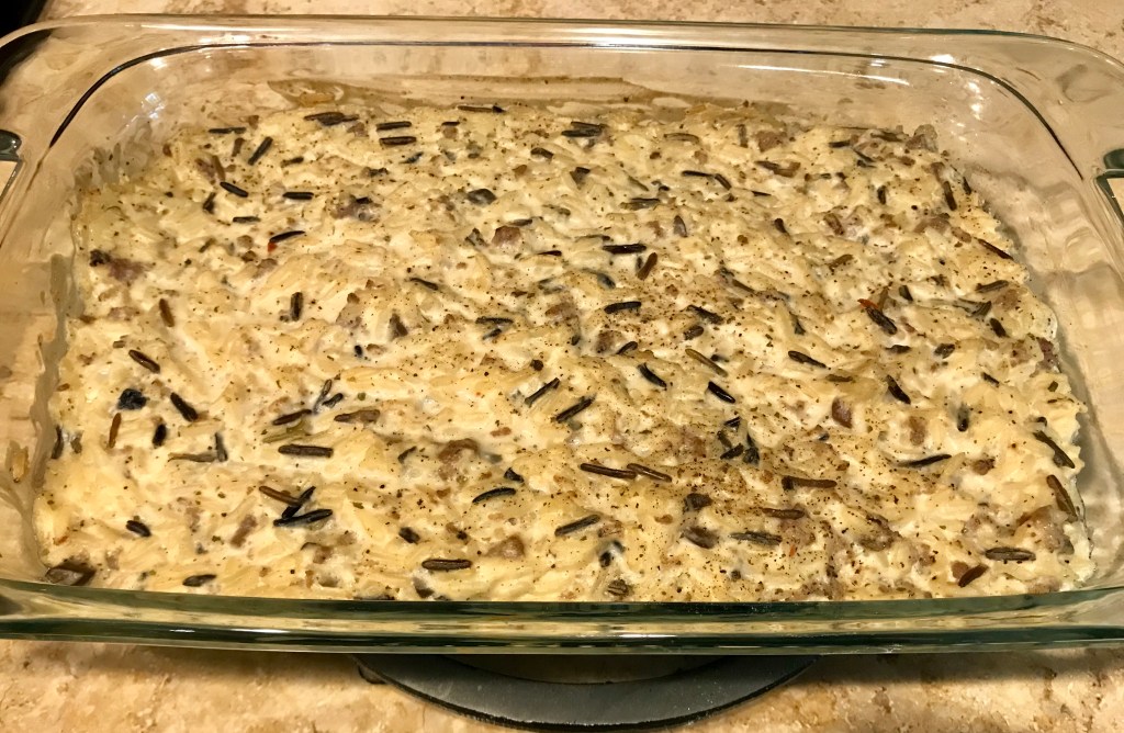 To prepare: Cook rice according to package instructions and set aside. Brown sausage crumbles and drain. Place rice and sausage into a large bowl. Add the cream of mushroom and sour cream. Mix together and season to taste with S & P. Place mixture in small casserole dish and bake for 30 minutes at 350 degrees.