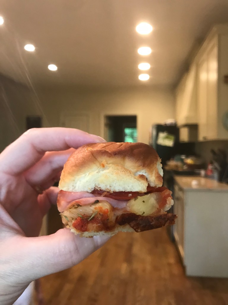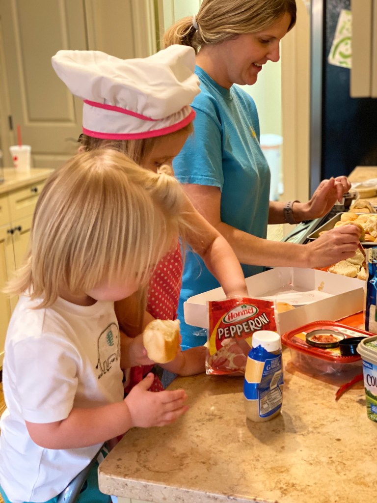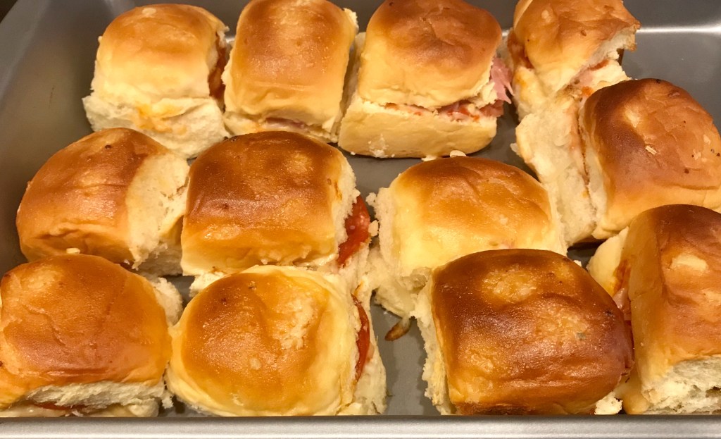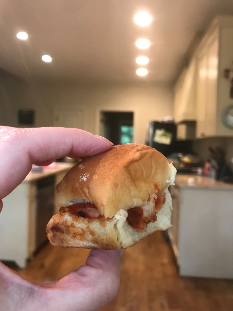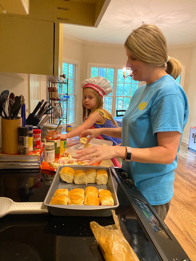 For the classic sliders, we repeated the same process with the marinara, cheese and seasoning. They gingerly placed pepperoni slices in the rolls which was the most important job of all. I even got my little in on the action. I handed her some pepperoni which she would promptly place into her mouth. She’s my girl after all!😋