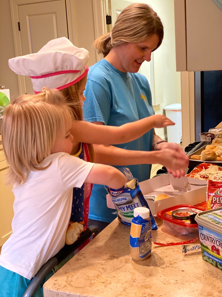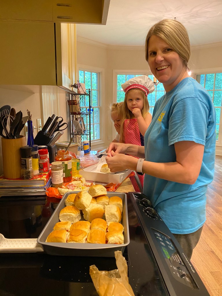 After thanking my sweet assistants, I finished the job by melting a few tablespoons of butter together with minced garlic. I gave that a good stir and brushed the mixture over the tops of the rolls. I popped them into a small baking pan and cooked on 400 degrees for 12 minutes. When ready, I served our sliders with side salads and Mediterranean pasta salad.