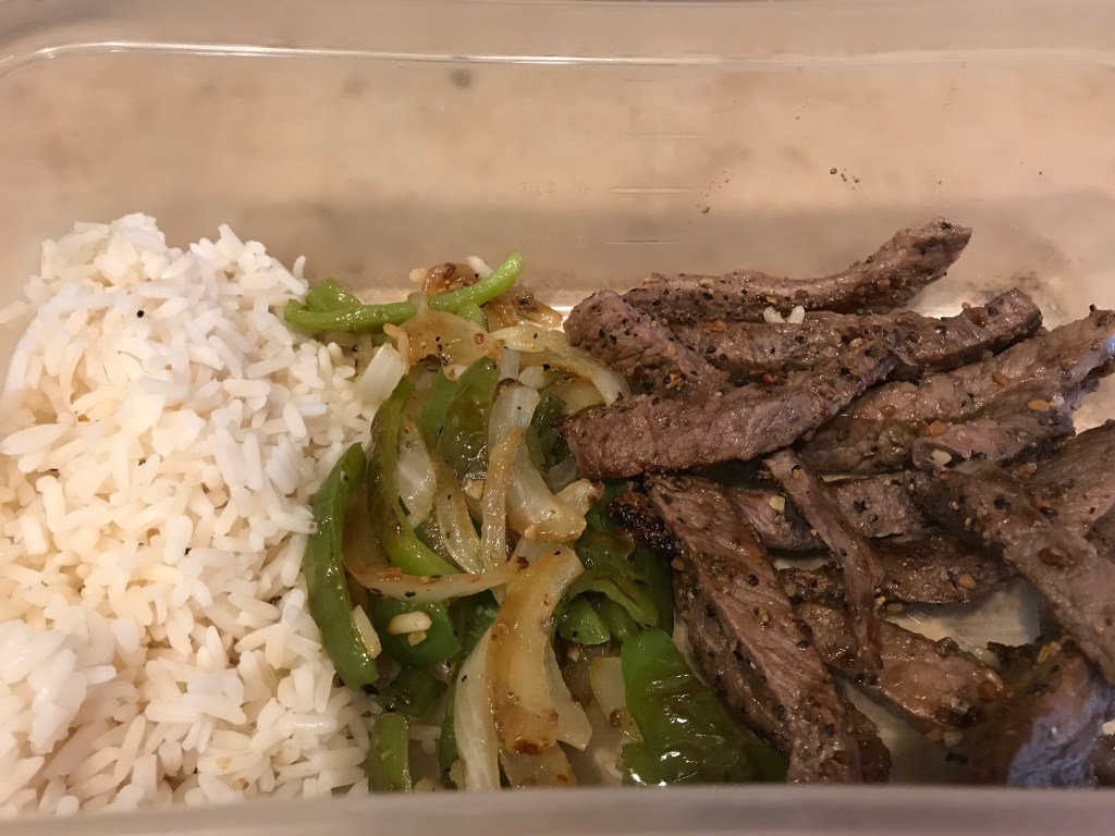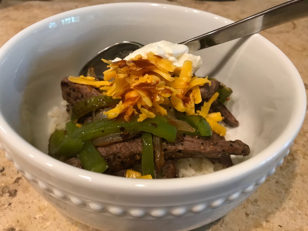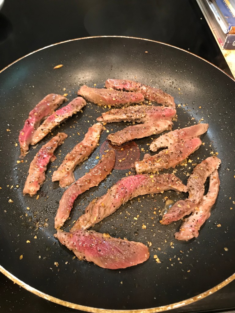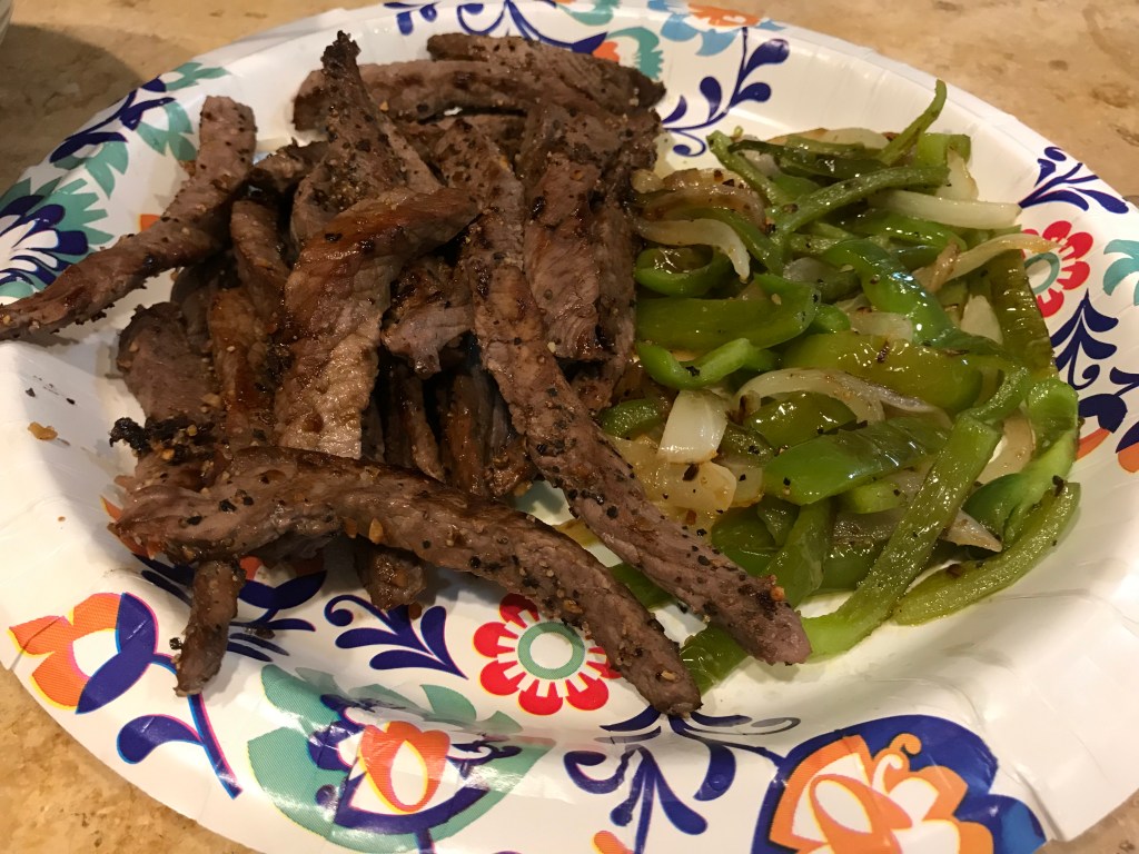 So, I brown the steak in the same pan that I used for the veggies. I generously sprinkle the strips with Montreal seasoning. I usually cook the steak in two batches so as not to overcrowd my pan. When done, I combine the meat with the veggies. Now I just assemble the components I want to serve it with and Voila: dinner is served. π½