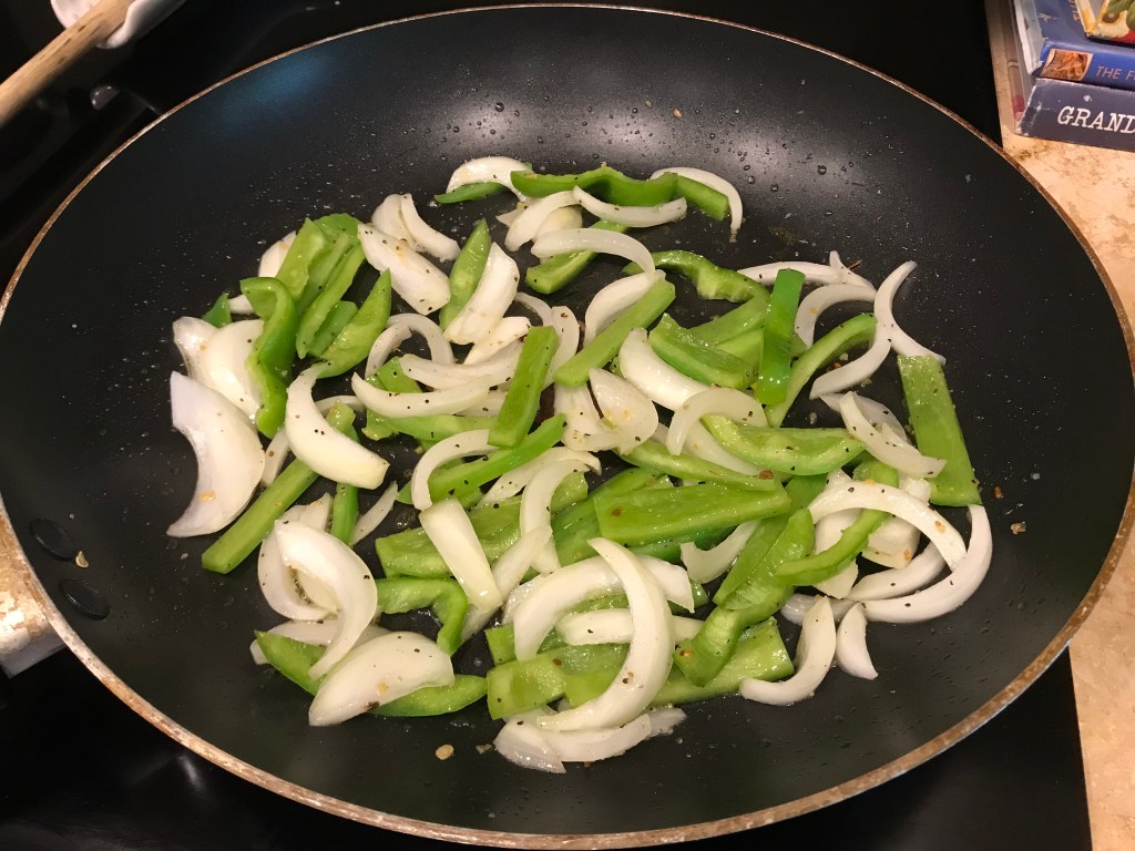 First, letβs start with the rice bowl. I like to use the rice in a bag because it is very reliable and I donβt have the best track record when it comes to rice. In fact, one of my pots still has tiny rice indentions on the bottom from sticking.π€« Anyway, I get the rice going and start on my veggies. I cut up both a small onion and bell pepper into long strips. I sautΓ© that in a little olive oil and S & P. I like to get the veggies slightly caramelized and then set them aside.