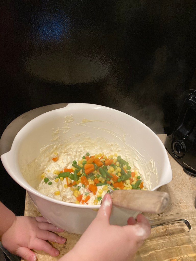 Next, I prepared a steamer bag of mixed vegetables and we added that to the mix. We also crushed up a sleeve of veggie crackers for the bottom layer. Harper liked counting the crackers and sampling them. Crushing was also super fun but a bit messy. 🤪🧹