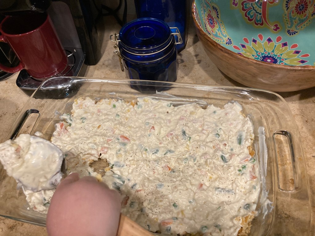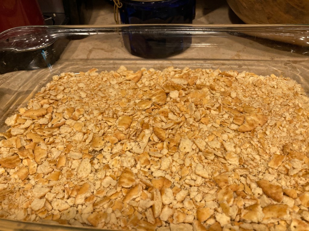 We spread the crackers on the bottom of a 9 x 13 casserole dish and distributed the chicken and vegetable mixture evenly over the top. Then we crushed up an additional sleeve of crackers into a small bowl and added about a tablespoon of melted butter to it. We mixed that around until all of the crumbs were coated and proceeded to sprinkle them on top.