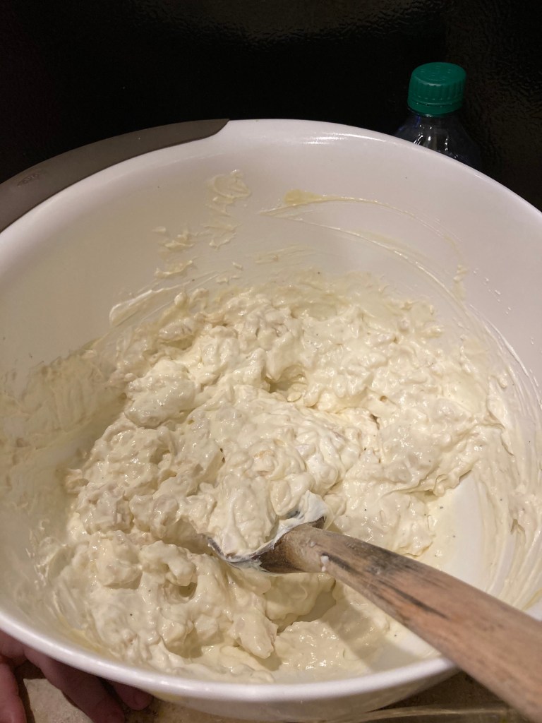 First, I assembled the ingredients. Then, I boiled two large chicken breasts. I drained and chopped the chicken into small pieces. I added that to a large bowl with about a cup of sour cream and a can of cream of chicken soup. You can play with the portions but I like mine to be really creamy. My daughter helped me to stir and season everything with salt and pepper.