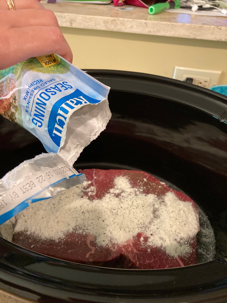 To prepare: Place roast in a slow cooker. Season with salt and pepper and sprinkle entire ranch packet over the top. Pour beef broth onto roast. Spread banana pepper rings to cover roast. Add dots of the butter on top of everything. Cover and cook on low for 8 hour in your crockpot. Shred with two forks and enjoy.π½
