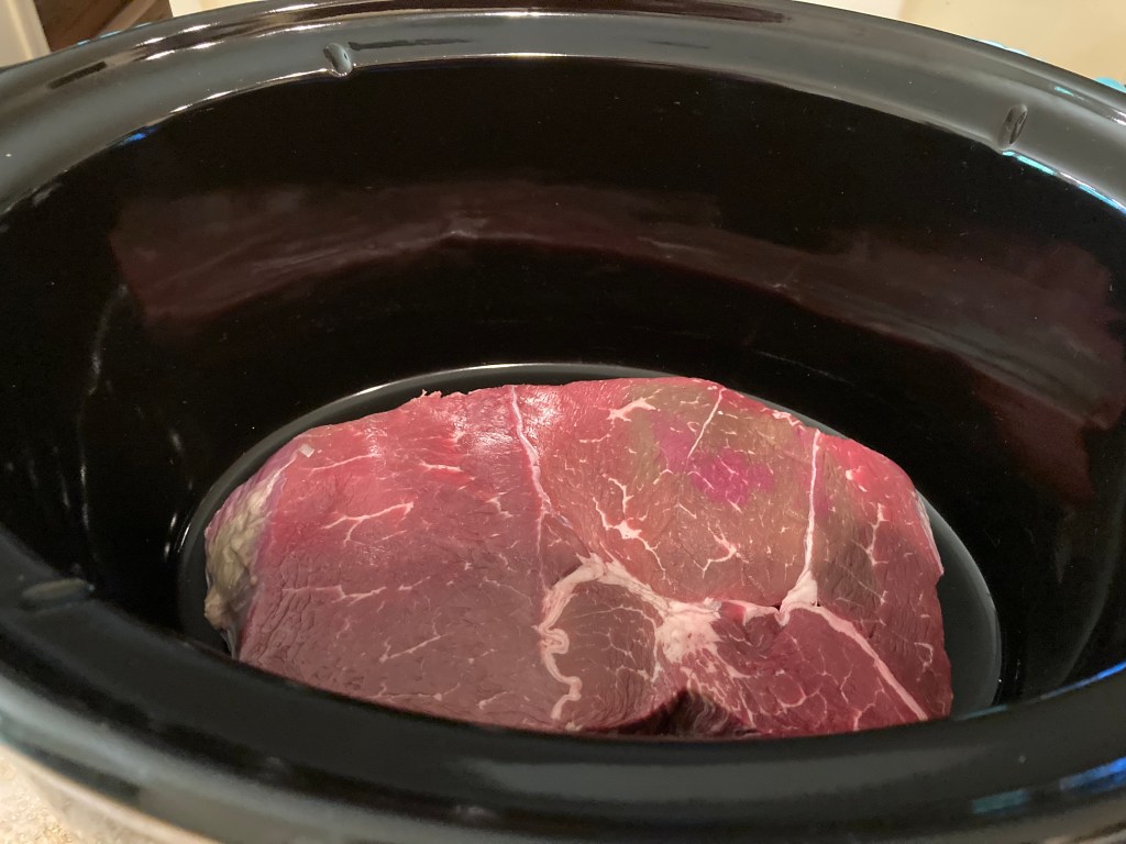 You will need: 1 pack of chuck roast, 1 cup of beef broth, 1 packet of ranch seasoning, half jar of banana pepper rings, 1/4 cup of butter