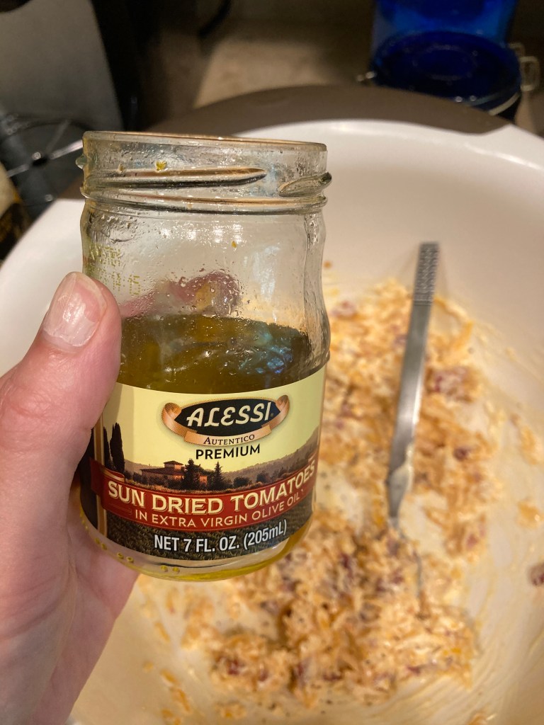 I’ve been making this delightful spread for several years now. I like to a little sour cream with the mayonnaise for a more balanced flavor (especially if you aren’t in love with mayo). I’ve also found that if you use sun dried tomatoes, you can add a little oil from the jar to really make it pop!