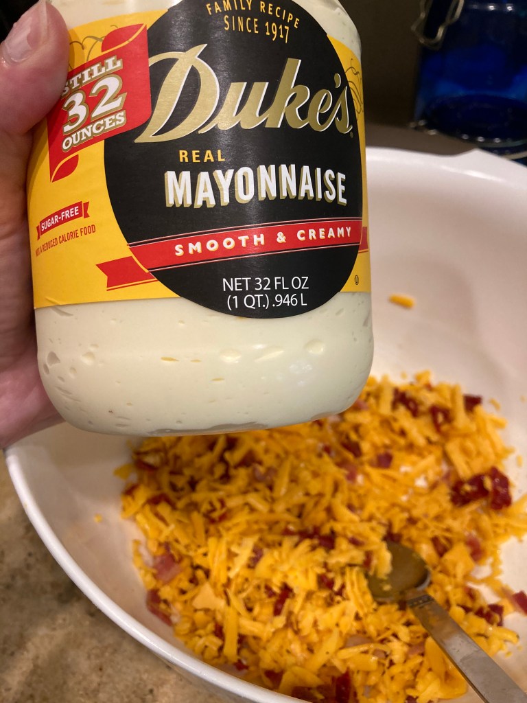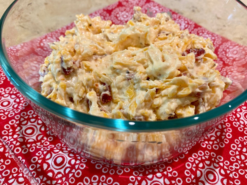 Can I still call it pimento cheese if I technically don’t use any pimento peppers?🤔 Truth be told, they’re not my favorite.🤫 I prefer to use diced jalapeños or sundried tomatoes. I also like to add bacon for added texture and a hint of smokiness.🥓👍