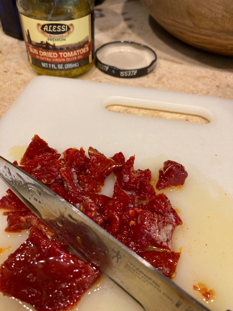 When finished with prep, I place all three ingredients into a bowl and season with salt and pepper. I add a few dollups of mayo to bind the ingredients as well as a little sour cream. I top this off with about a tablespoon of the sundried tomato oil. I give everything a good stir, season to taste and chill for a few hours. So yum! ✌️💜🍴