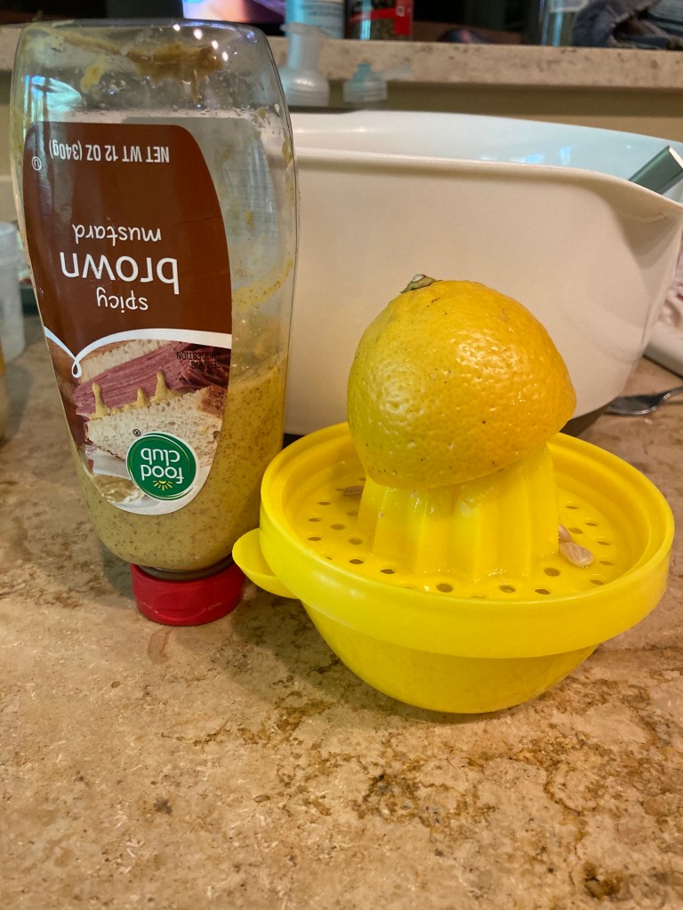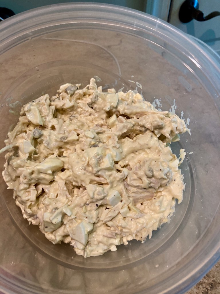 For hubby’s salad, I added the eggs and a few tablespoons of diced jalapeño. Next, I added a few big dollops of mayo and a couple squirts of spicy mustard. Then, I topped everything with juice from half a squeezed lemon and seasoned once more. Hubby taste tested and approved. Now it’s time to chill in the fridge.😎