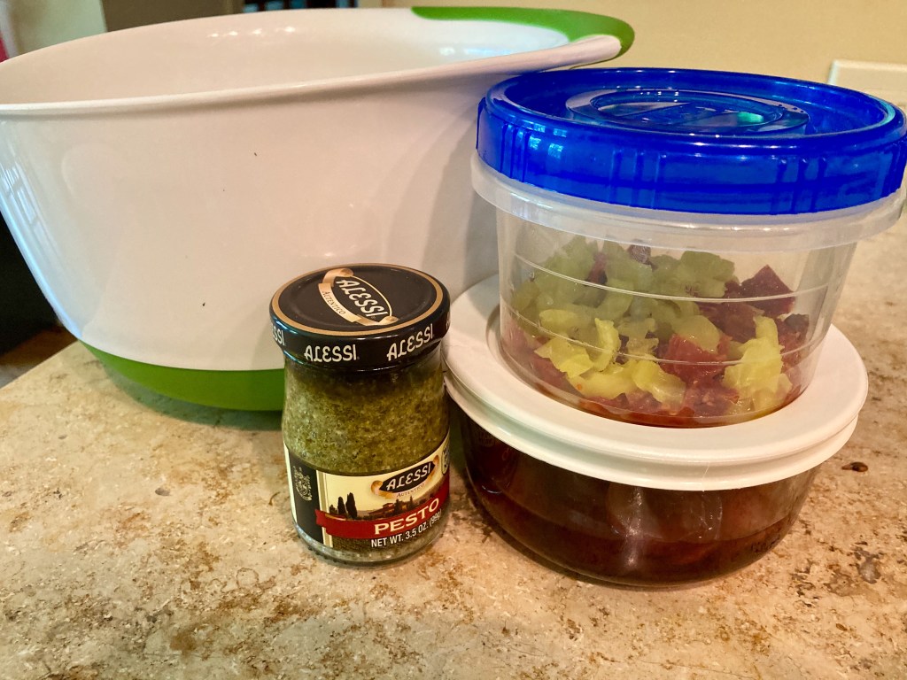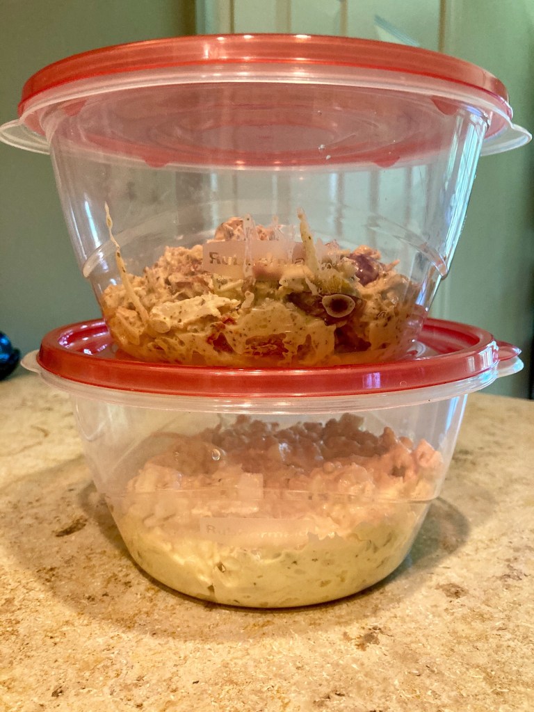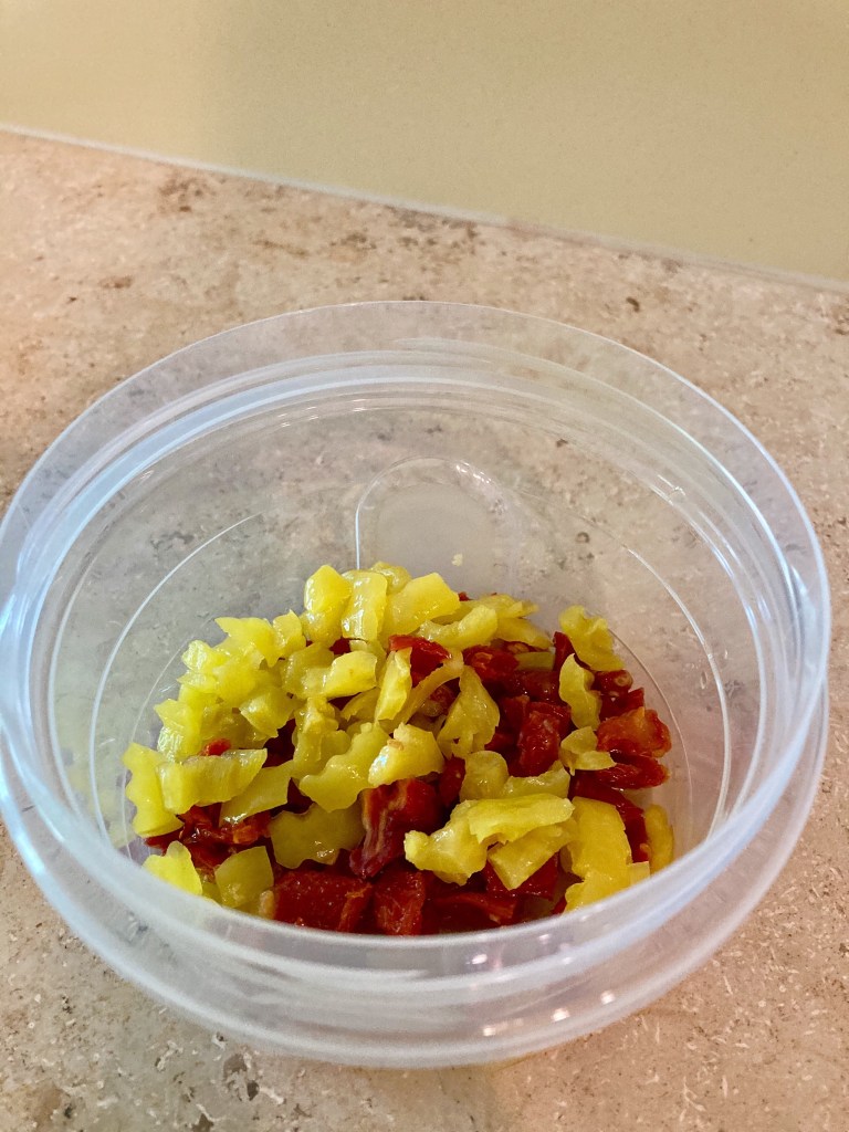 So, I decided to make two different types to satisfy all parties. I started by boiling a few chicken breasts and three eggs. While that was going, I diced up a few sun dried tomatoes and banana pepper rings (my go to combo). I learned the next trick from Antoni on Queer Eye. I halved several red grapes and soaked them in red wine vinegar.