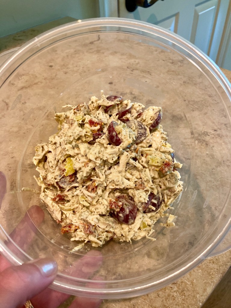 For my batch, I seasoned the chicken and added the chopped veggies. I mixed in half of a small jar of pesto and added the grapes. I added another tablespoon or so of pesto and a couple small spoonfuls of mayo. I seasoned once more and added a few shakes of fresh lemon juice. Mmmm, the taste test revealed the deliciousness!😋 Plus, it’s so pretty! This would be great for a ladies lunch or get together. It would also be fab on crackers or in a croissant!