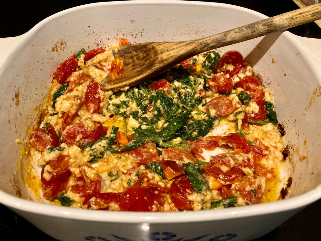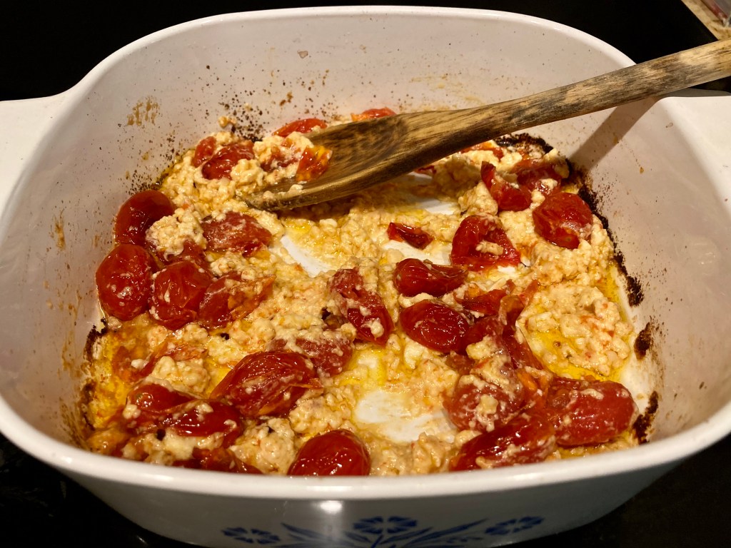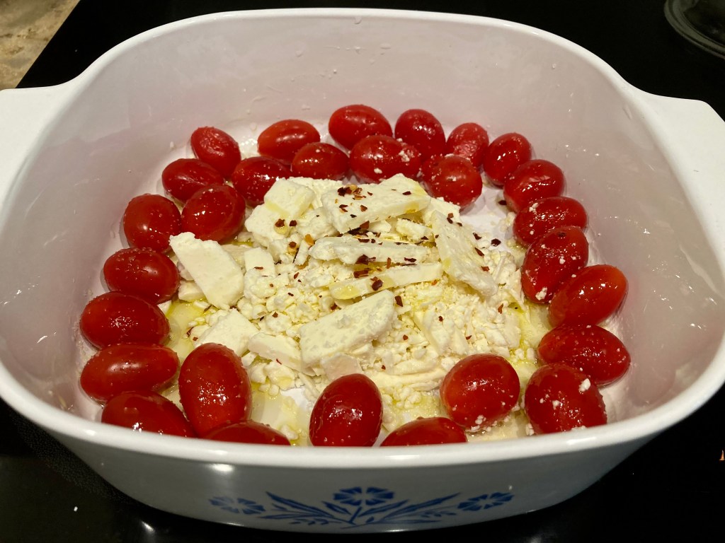 To prepare: Place tomatoes in a baking dish and toss with olive oil, salt and pepper. Place feta crumbles in the middles into a mound with the tomatoes surrounding it. Drizzle more olive oil over the top. Add a couple pinches of red pepper flakes over the cheese. Bake at 400 for 30 minutes and then at 450 for an additional 5 minutes or so until the cheese is slightly browned.