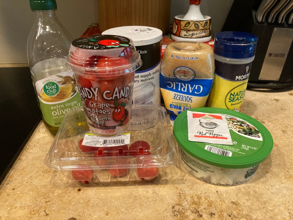 You will need:ย ย One package ofย cherry tomatoes, container of feta cheese crumbles, olive oil, red pepper flakes, half bag of spinach, half package of penne pasta, 4 cloves of garlic, S & P