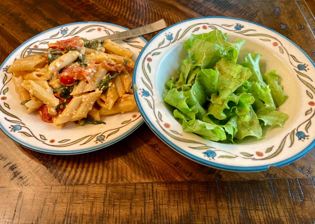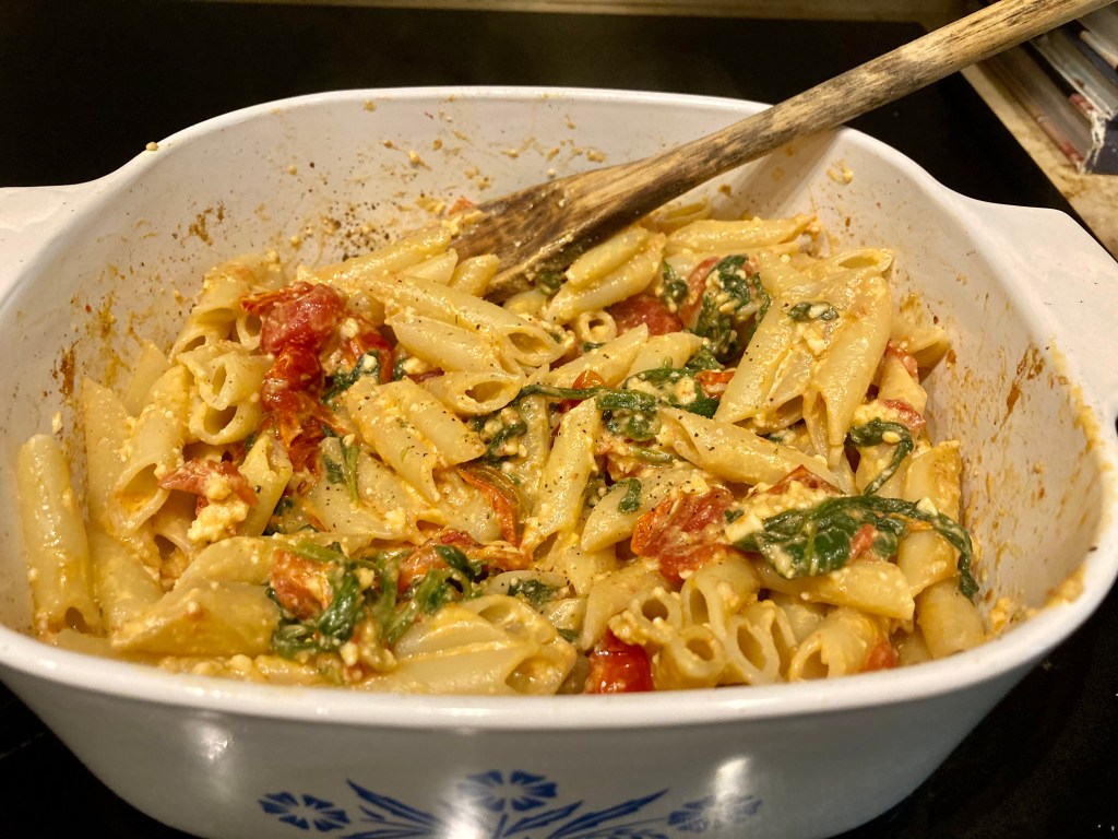 This dish was very easy to make. You basically bake the tomatoes and cheese with some spices until the cheese bubbles and the tomatoes sing, add garlic, stir some cooked pasta in and presto! I served it with a simple salad and it hit the spot.๐๐ฅ