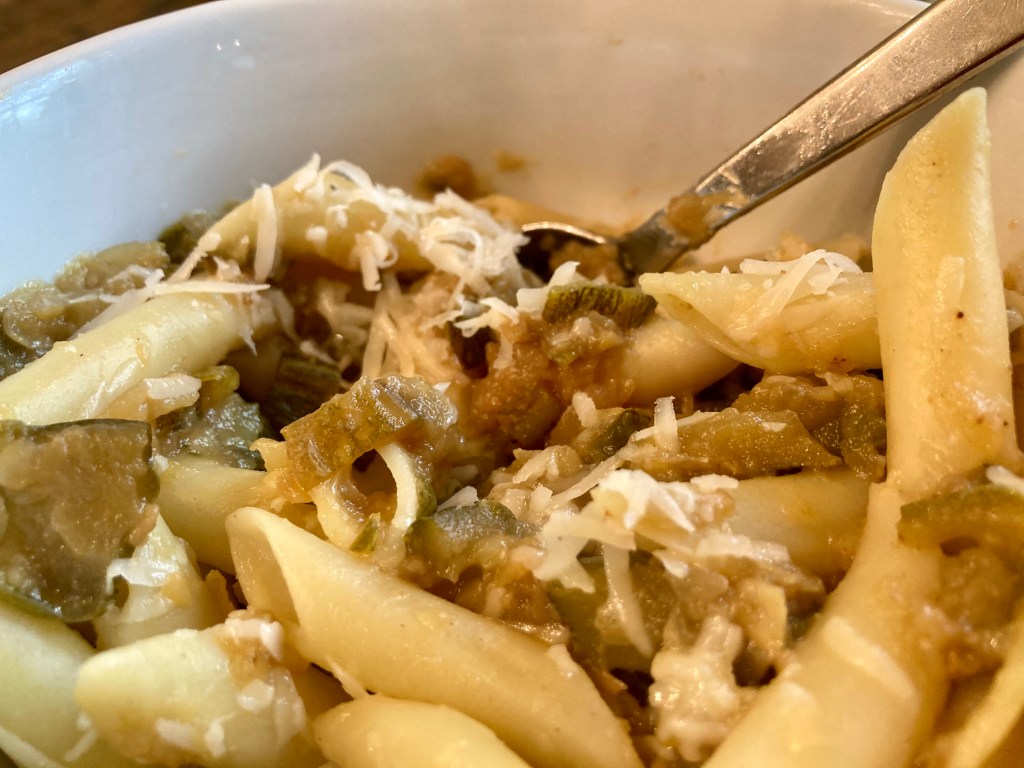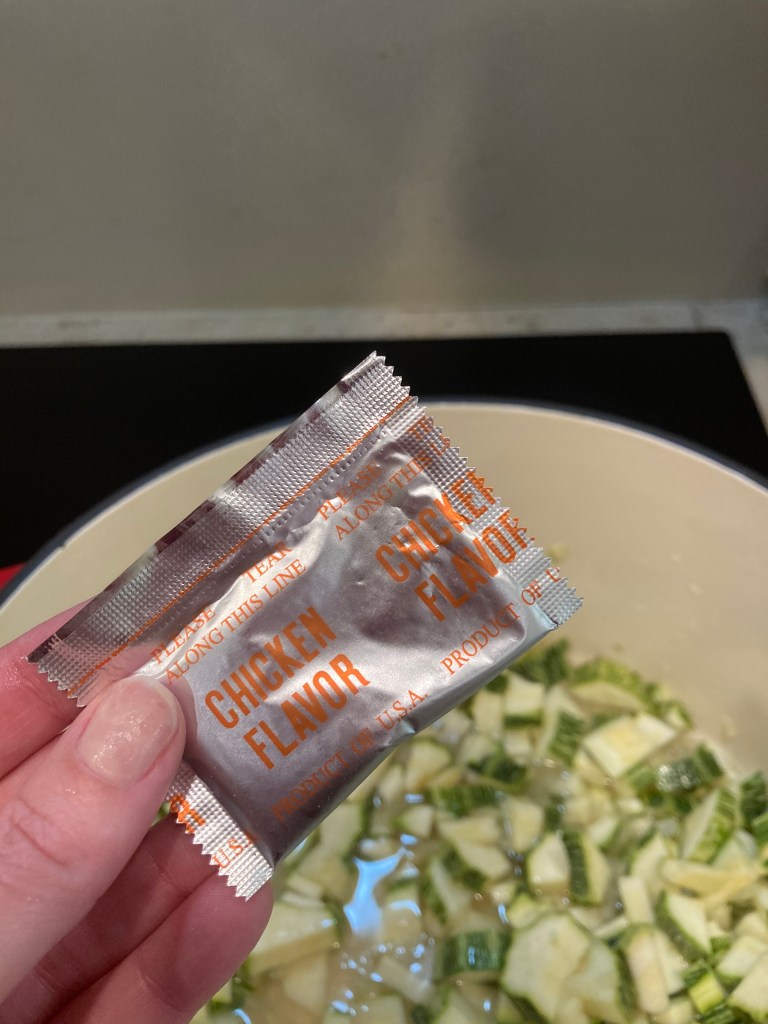 You will need: 3 zucchini, small yellow onion, ramen chicken seasoning packet (or chicken bouillon cube), pinch of ancho chili powder (or red pepper flakes), T of lemon juice, 1/2 cup of armesan cheese, package of penne or similar pasta